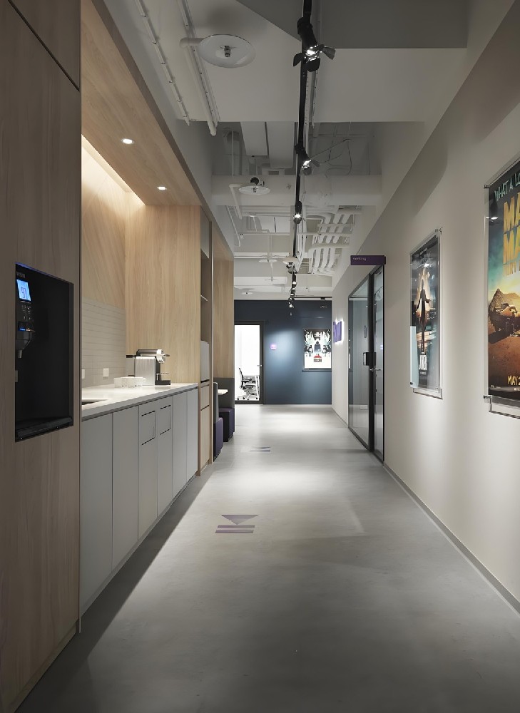 觀為監(jiān)測辦公室設(shè)計通過簡約的線條和色彩搭配,運用抽象圖案和鮮艷色彩,以紫色和白...... 項目面積:1100㎡ 施工工期:45天