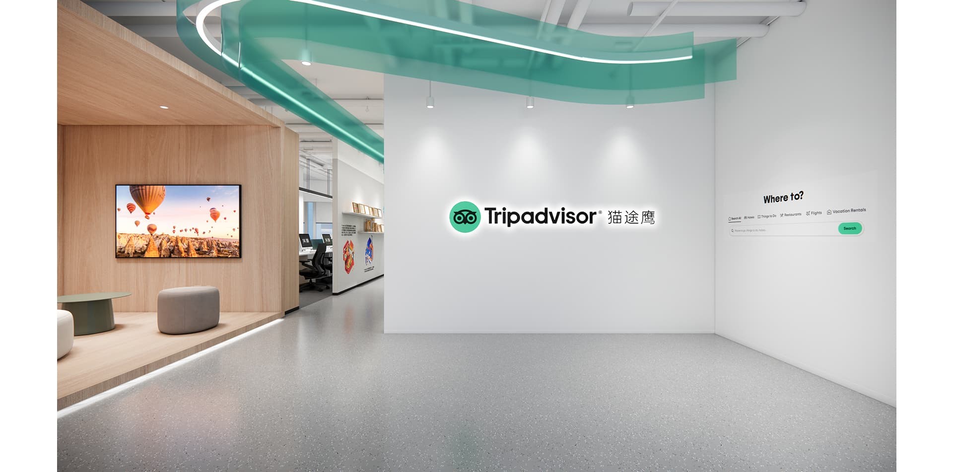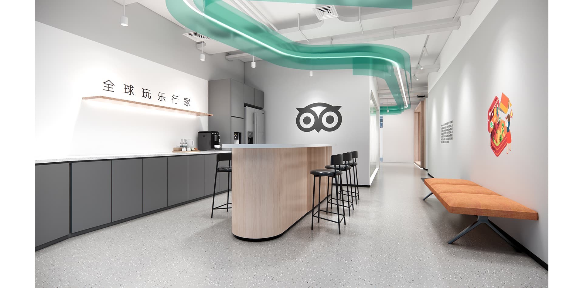 貓途鷹辦公室裝修設計以?簡約靈動?為基調,融入品牌標志與?全球旅行元素?,搭配開放式布局與活力色彩,打造兼具協(xié)作效率與探索氛圍的辦公空間。